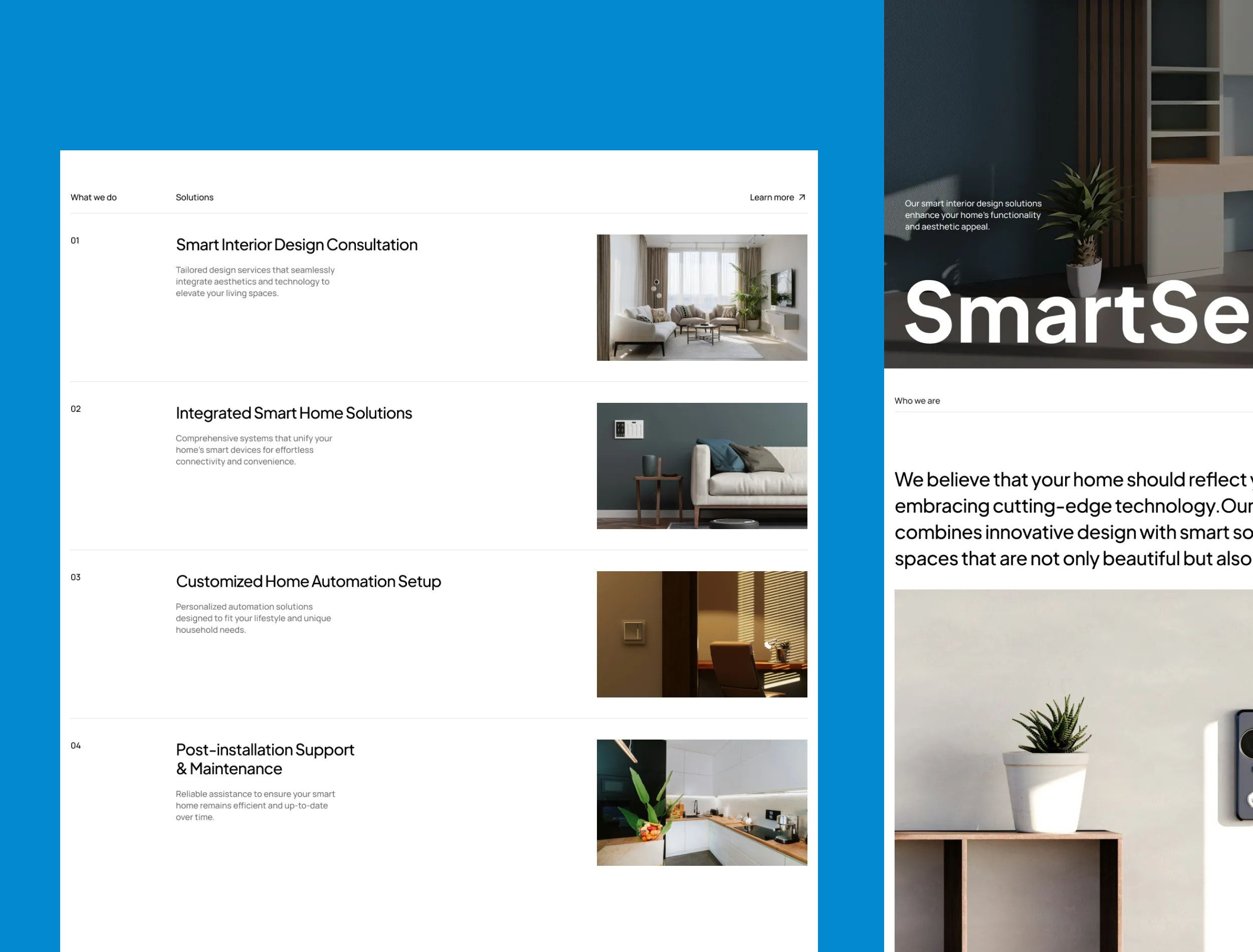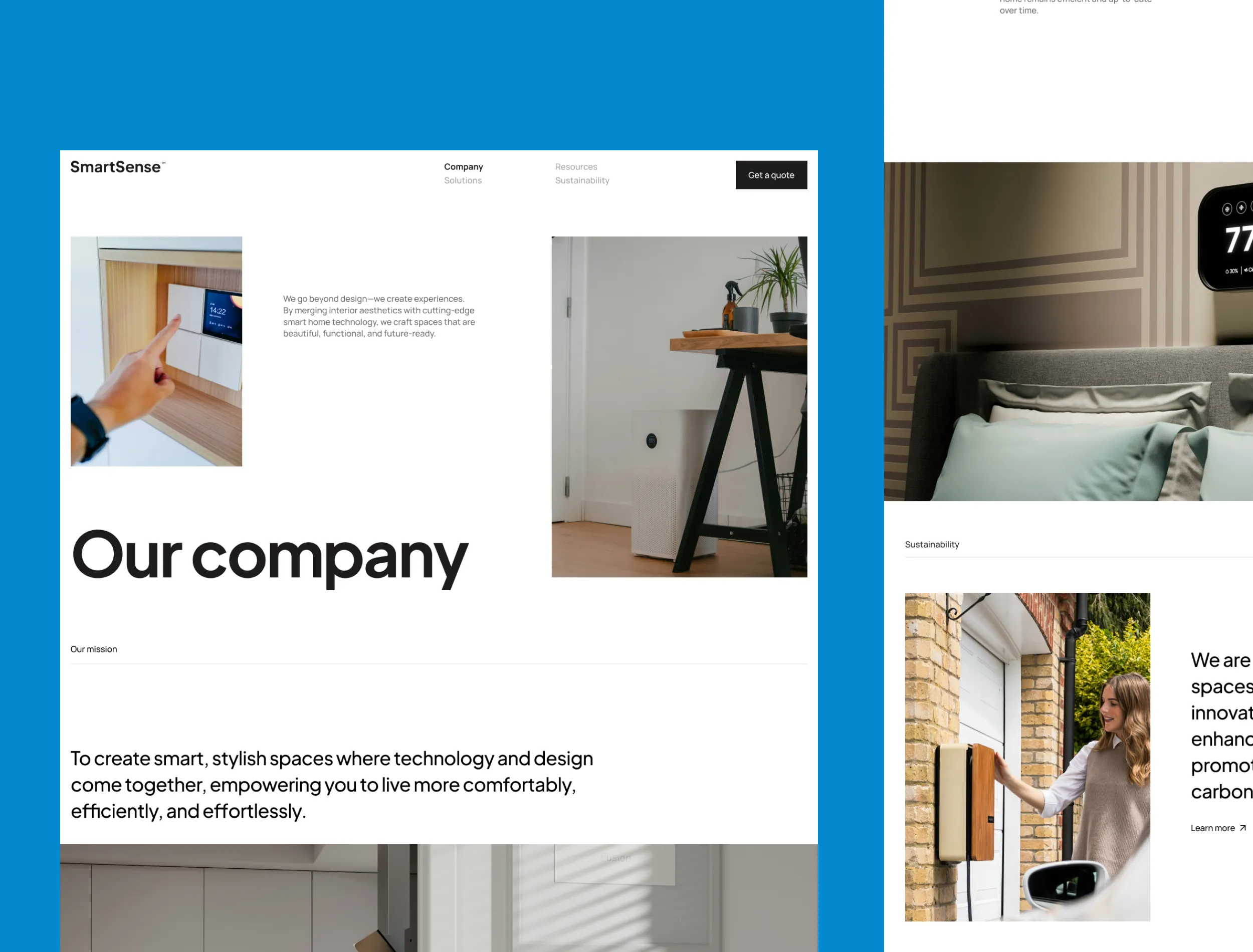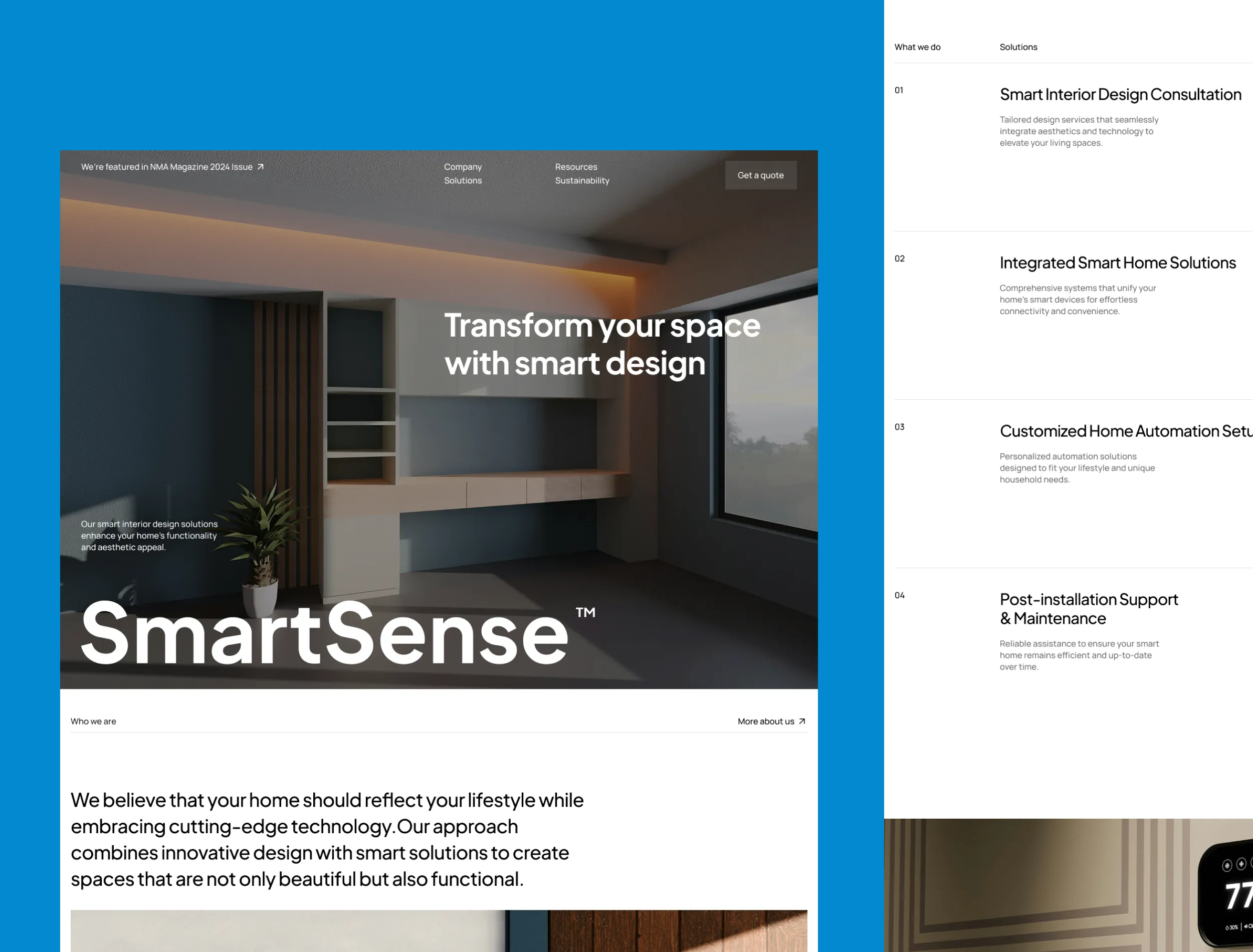 SmartSense is a conceptual brand that combines smart home technology with interior design. The goal was to create a polished digital presence that reflects a modern, solution-based service model.